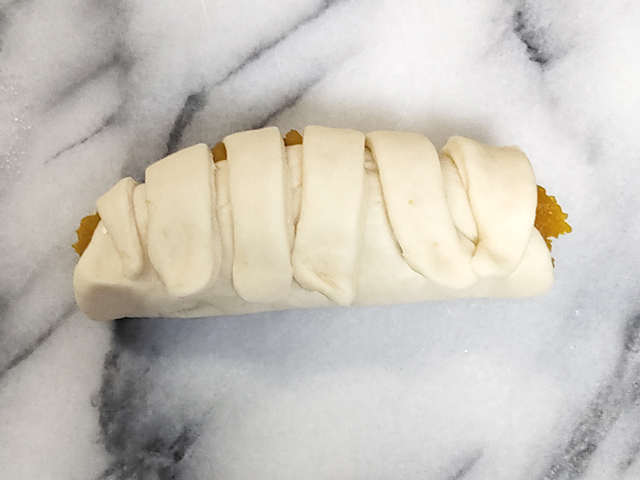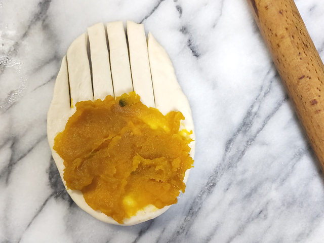 16:手前から半分ほどに南瓜あんを乗せ、手前から半分ほど巻き、上半分にカードで切り込みを入れます。