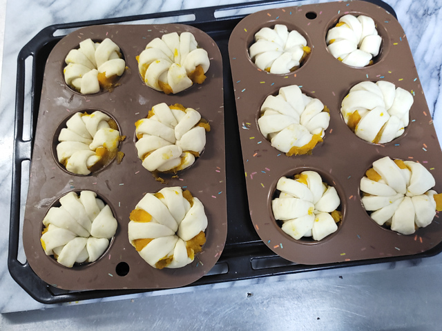 19:とじ目を真下にしたら、ぐるりと回るように成形し、マフィン型に詰めましょう。