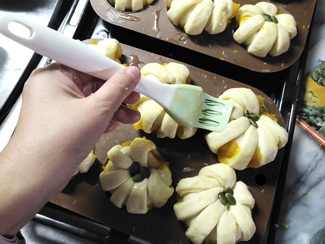 22:表面に溶き卵(分量外)を刷毛で塗り、中央に三つほど南瓜の種を飾ります。