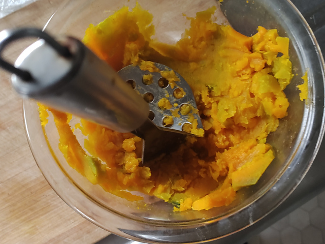 3:竹串がすっと通るくらいになったら、マッシャーで細かくつぶします。