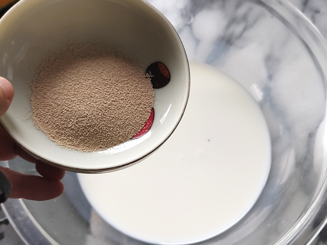 5:別のボールに、人肌程度に温めた牛乳とイーストを入れて、軽くかき混ぜながら溶かしておきます。