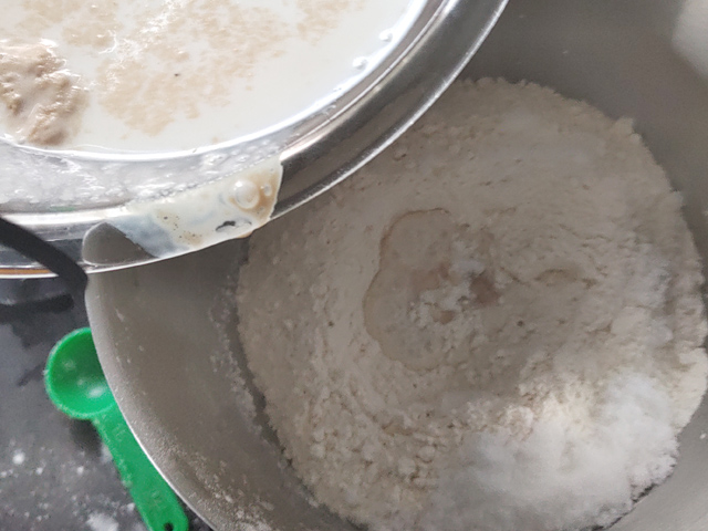 6:スタンドミキサーに、強力粉、砂糖を入れ、中央を窪ませましょう。