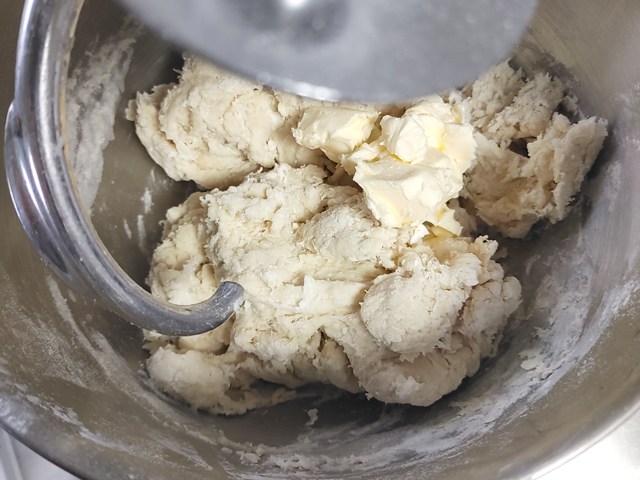9:粉っぽさがなくなったら、マーガリンを加えてさらにミキシングし、生地がフックにくっついて一固まりになったらOK。