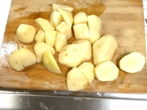 ![]() ①じゃがいもは皮をむき、大きめの一口大に切ります。 |