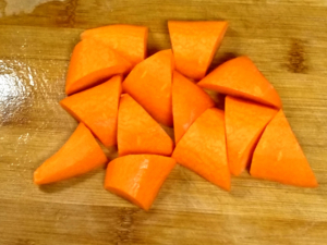 ![]() ②人参は皮をむき、大きめの乱切りにします。 |