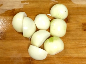 ![]() ③玉ねぎは皮をむき、1/2にカットしましょう。 |