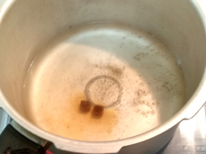 ![]() ④圧力鍋に、お湯、酒、マギーブイヨン、塩、黒コショウを入れて火にかけ、調味料をしっかりと溶かします。 |
