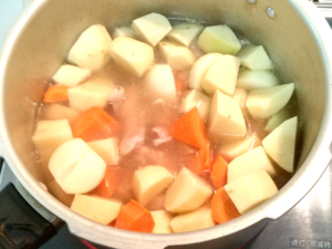 ![]() ⑤調味料が溶けたら、手羽元→人参→玉ねぎ→じゃがいもの順に加えて蓋をし、蓋をしたら、強火にかけましょう。 (じゃがいもが2/3くらい水に浸かる程度の水加減にします。) |