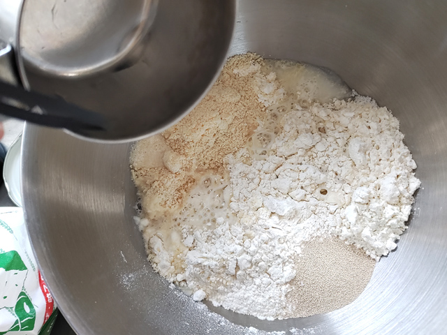 1:スタンドミキサーのボウルに、マーガリン、ピザ用チーズ、ソーセージ以外の生地の材料を入れます。