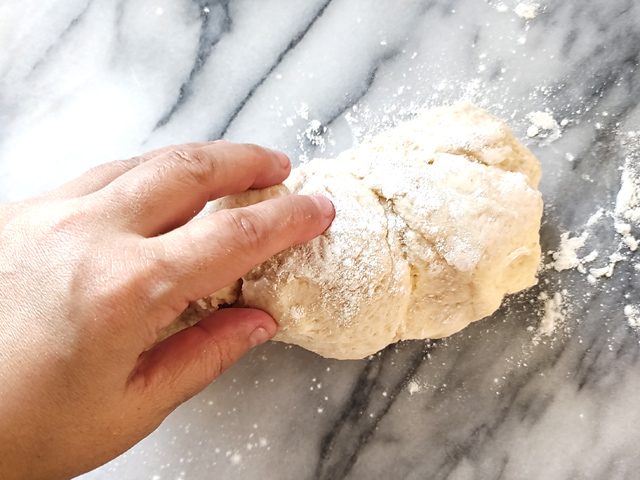 4:台の上に、強力粉少量で打ち粉(分量外)をし、生地が滑らかにになるまで、5~6分捏ねましょう。