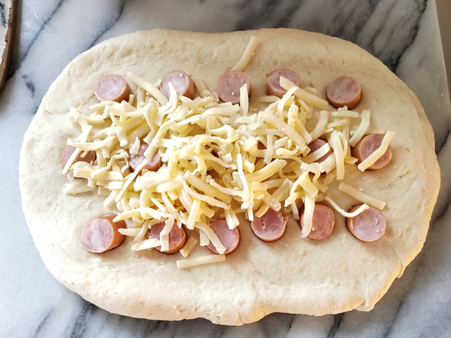 11:ソーセージをまず乗せ、上にピザ用チーズを散らしたら、手前から巻きましょう。