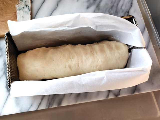 12:パウンド型にクッキングシートを敷き、とじ目を下にして、生地を入れます。