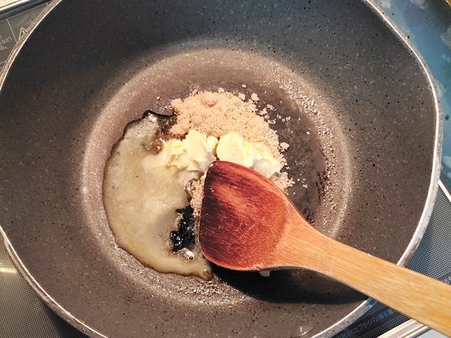 1:フライパンにりんごミックス用のマーガリンと三温糖を入れ、中火にかけて、マーガリンが溶けるまでかき混ぜながら溶かします。