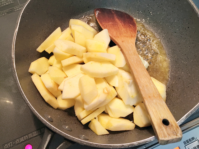 3:りんごが黄金色になるまで、優しくかき混ぜながら、3~5分炒めます。