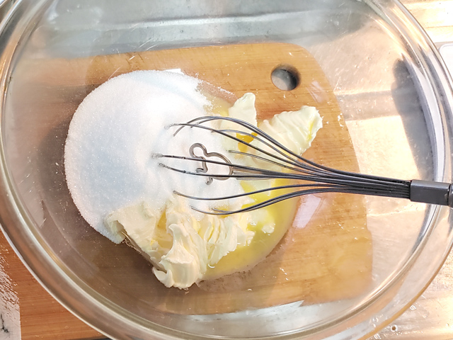 8:ボールにグラニュー糖を加え、白っぽくふわふわになるまで、泡立て器ですり混ぜましょう。