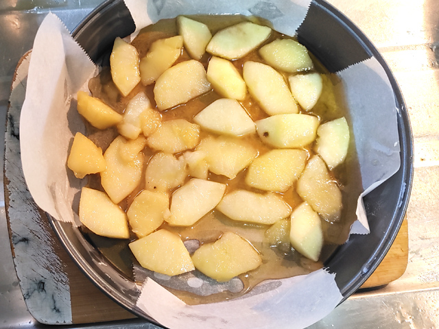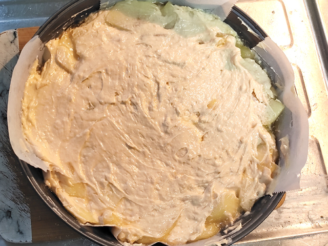 11:スポンジ生地の半量を用意しておいたりんごの上に乗せ、残りのりんごで覆いましょう。