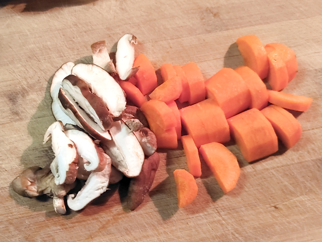 1:人参は皮をむいて、厚めの半月切りに、椎茸は石づきを落として薄切りにします。