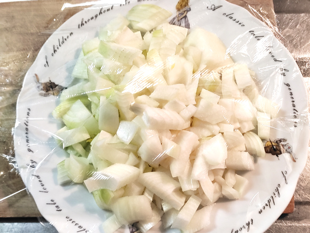 2:玉ねぎは皮をむいて、粗みじん切りしにてから、耐熱容器に入れ、ラップをして、レンジで10分ほど加熱しましょう。