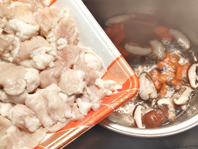またもし冷凍のモツを使う時には、解凍せずにそのまま入れてOKです。