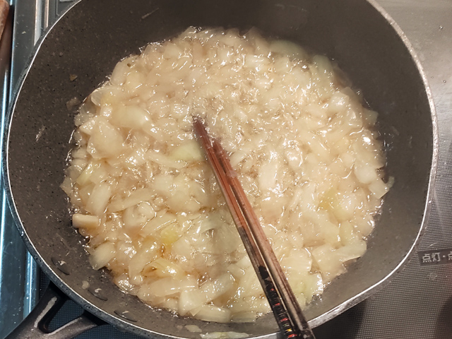 5:フライパンに玉ねぎを入れて弱めの中火にかけ、油が全体に行きわたる(分量外)くらい入れ、8~10分炒めて、飴色玉ねぎを作ります。