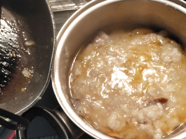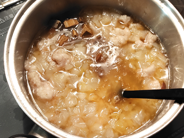 6:シマチョウが入った鍋に玉ねぎを加え、3~4分煮ましょう。