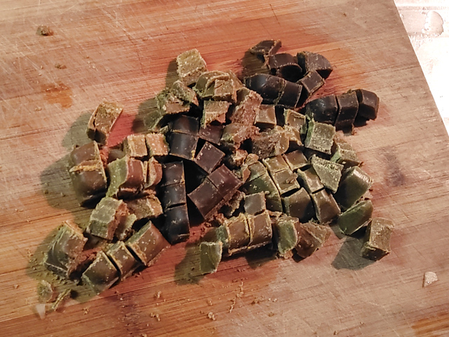 7:煮ている間に、カレールーが溶けやすいように、包丁でカットしておきます。