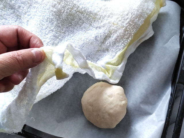 11:天板にクッキングシートを敷き、閉じ口を下にした生地を並べ、濡れ布巾とラップで乾かないように保護したら、40度のオーブンで30分ほど置きます。