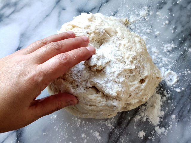 5:台の上に軽く強力粉(分量外)で打ち粉をし、6~8分ほど、表面が滑らかになるまで捏ねましょう。