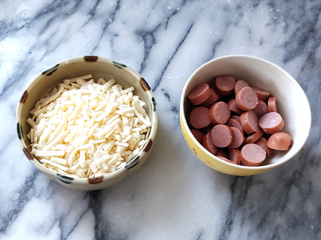 7:一次発酵をかけている間に、チーズは室温に、ソーセージは薄めの輪切りにしましょう。
