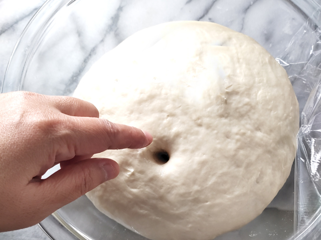 8:生地が2倍ほどに膨らみ、指で押してみて、穴が戻らなければ、一次発酵は完了です。