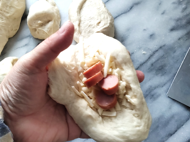 10:生地を広げて、ピザ用チーズとソーセージを中に包み込み、しっかりと口を閉じましょう。