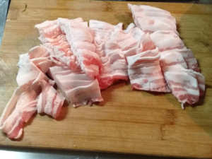 ![]() ①豚バラ肉の薄切りは、食べやすい長さに切ります。 |