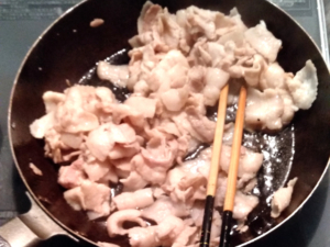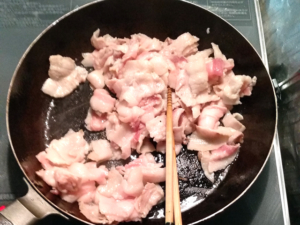 ![]() ②フライパンに薄く油(分量外)を引き、豚肉を弱火で炒めましょう。 (弱火の方がフライパンにこびりつかなくて済みます。) |