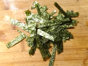 ![]() ⑥丼にご飯を盛りつけ、上に海苔を散らし、更にその上に肉を盛りつけたら、完成です。 |