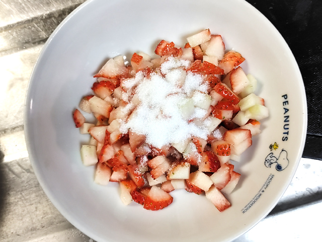 9:耐熱ボールに、苺、苺用砂糖、レモン汁を入れ、ラップをしてレンジで30秒加熱しましょう。