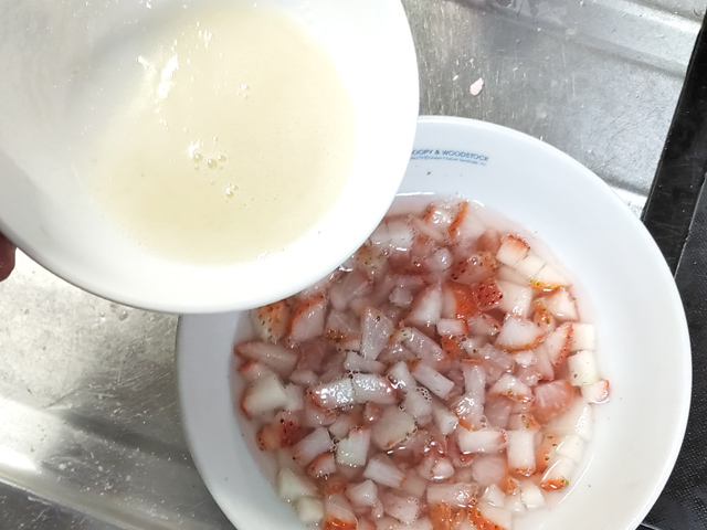 11:溶けたゼラチン液を、苺のボールに加えて、冷蔵庫で軽くとろみがつくまで冷やしましょう。