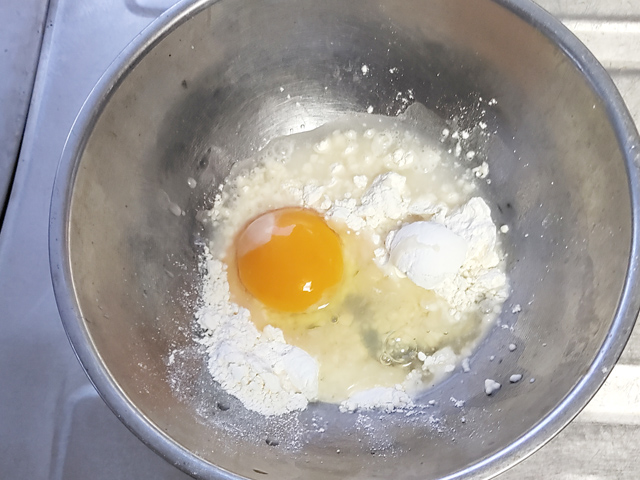 1:ボールに、衣用の薄力粉、水、卵を割り入れて混ぜます。