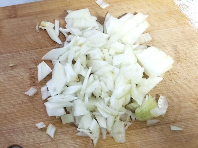 3:玉ねぎは皮をむき、粗みじん切りにしましょう。