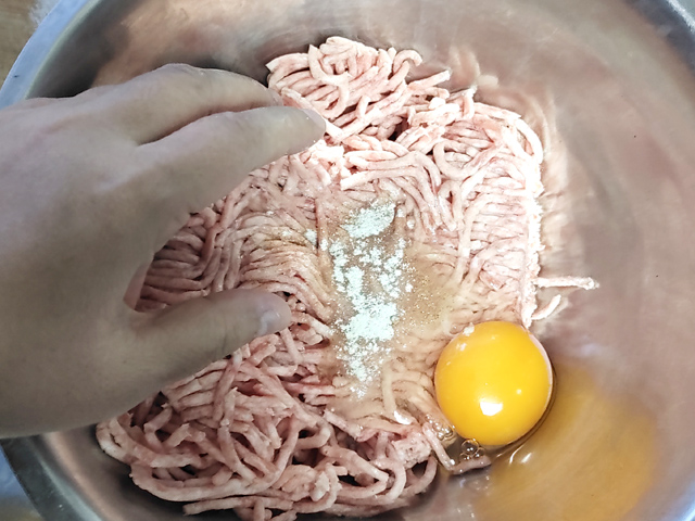 4:ボールにメンチカツの玉ねぎ以外の材料を全て入れ、粘り気が出るまでよく捏ねます。