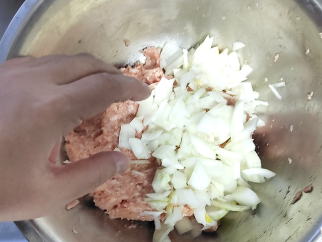 5:粘り気が出たら、玉ねぎも加えて混ぜ合わせます。