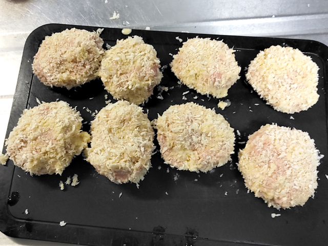 7:8等分したタネに、バッター液→パン粉の順に衣をつけます。