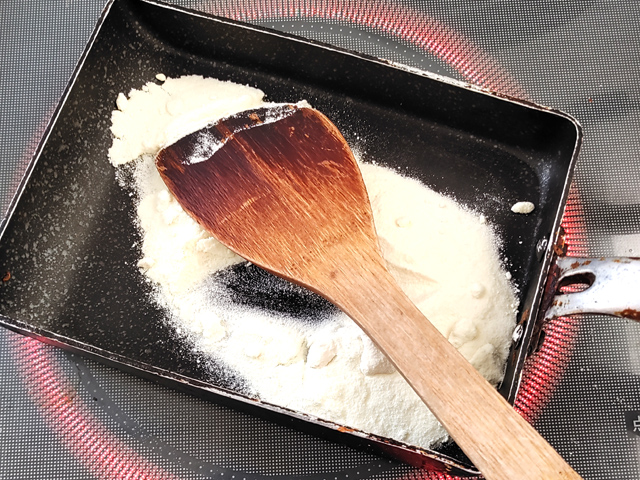 1:フライパンにスキムミルクを入れ、弱火で黄金色になるまで温めます。