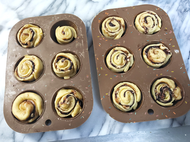 16:端を下に折りこみ、シリコン製のマフィン型に乗せましょう。