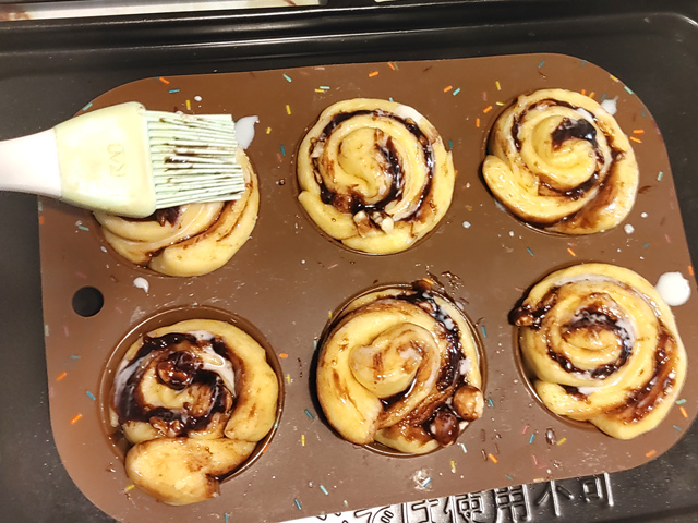 18:オーブンを180度に温め始め、パンの表面に牛乳(分量外)を塗り、残りのナッツとザラメ糖を散らし、25分ほど焼きましょう。