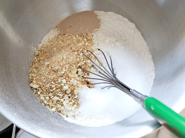 3:スタンドミキサーのボールに、強力粉、冷ましたミルクパウダー、イースト、砂糖を入れて、泡立て器で混ぜます。