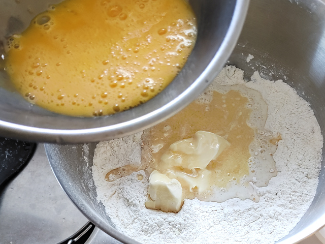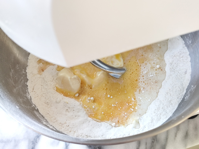 6:水、溶き卵、マーガリン、バニラを加えて、弱で混ぜます。