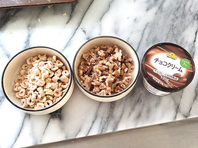 9:クルミとヘーゼルナッツは細かく刻み、チョコスプレッドは室温に戻しておきましょう。