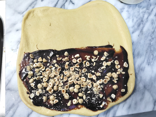 11:チョコスプレッドをレンジで10秒ほど温めて、柔らかくし、生地の上半分に均等に広げます。