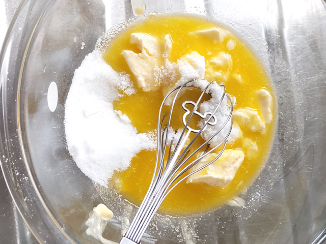 2:グラニュー糖を加えて、白っぽくふわふわするまですり混ぜましょう。