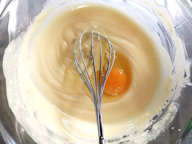 3:卵を1個ずつ割り入れ、その都度よく混ぜます。